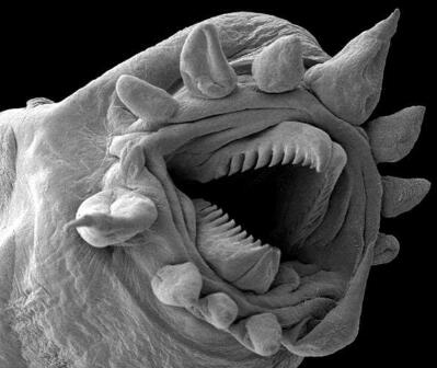- 仔细观察还可能发现头部区域有眼点以及位于中部(身体中部)附近的咽部。